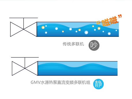 傳統(tǒng)機組在冷媒流量調(diào)節(jié)時會發(fā)出類似“茲茲”的液流噪音,GMV水源熱泵直流變頻多聯(lián)機組采用專業(yè)的過冷度控制技術(shù),確保冷媒以純液態(tài)形式進入節(jié)流,有效解決內(nèi)機液流聲問題,噪音更低。