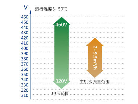 水側(cè)換熱器進水范圍:5~50℃,主機水流量范圍:2~9.5m3/h,滿足全國大部分地區(qū)的地理環(huán)境使用要求;電壓范圍提升至320V-460V,遠超342V-420V的國家標準,輕松應(yīng)對電壓不穩(wěn)問題。