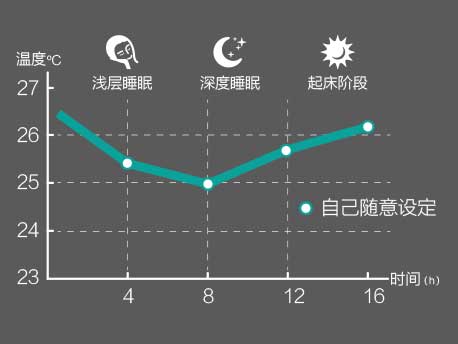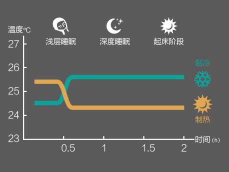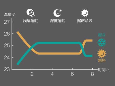 舒睡模式:在制冷模式下適當(dāng)提高溫度,在制熱模式下適當(dāng)降低溫度,貼合一般人群的體溫節(jié)律變化,睡眠更舒適。